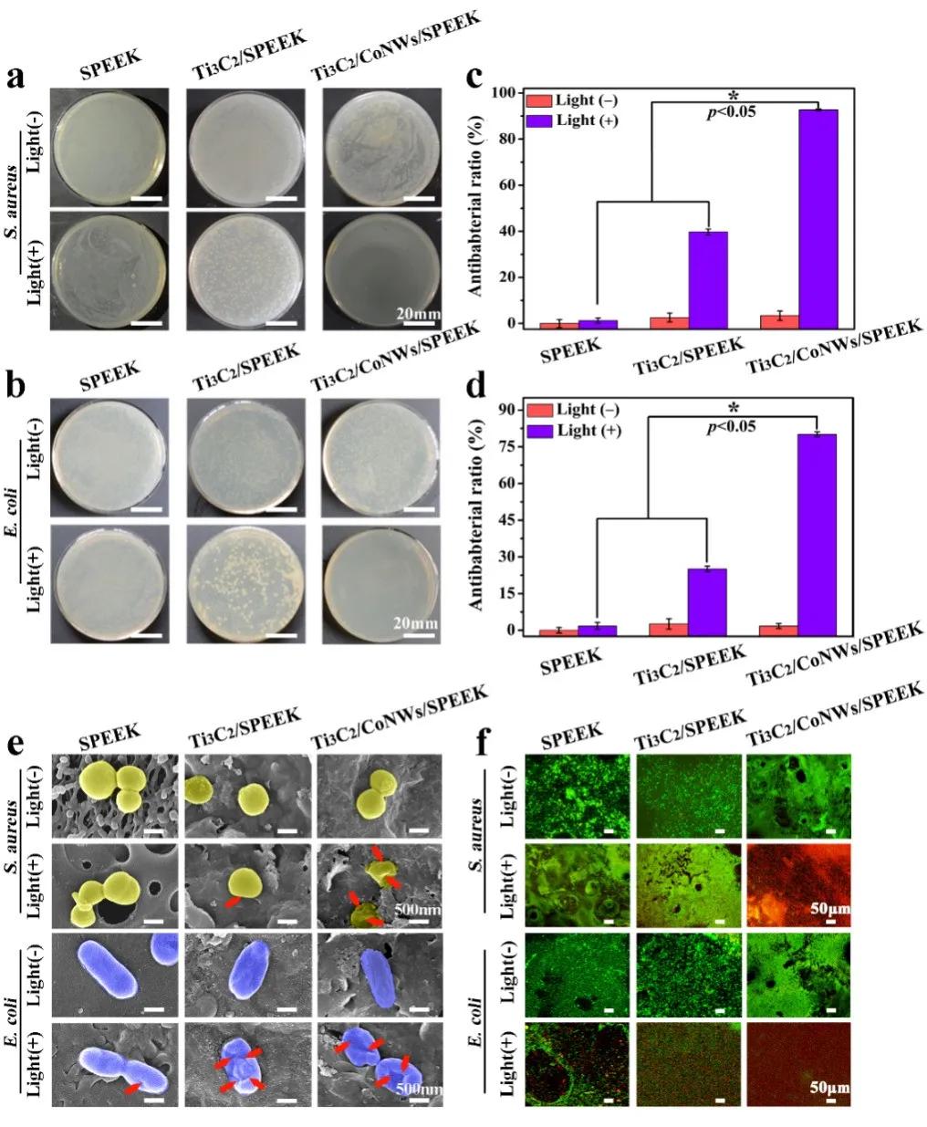 Ti3C2/CoNWs涂層在近紅外光觸發(fā)下產(chǎn)生的光熱和光動力學(xué)效應(yīng)可以在20分鐘內(nèi)對革蘭氏陽性金葡萄球菌/革蘭氏陰性大腸桿菌就行殺滅,達(dá)到90%以上的抗菌效果(圖2)。此外,體外細(xì)胞實驗結(jié)果表明異質(zhì)結(jié)具有較好的細(xì)胞相容性。綜上所述,該新型MXene/CoNWs生物異質(zhì)結(jié)涂層賦予了PEEK植入體優(yōu)異的雙重光熱/光動力協(xié)同抗菌特效,大大拓寬了PEEK植入體在感染性骨缺損修復(fù)領(lǐng)域的臨床應(yīng)用,避免了抗生素耐藥菌的科學(xué)難題。